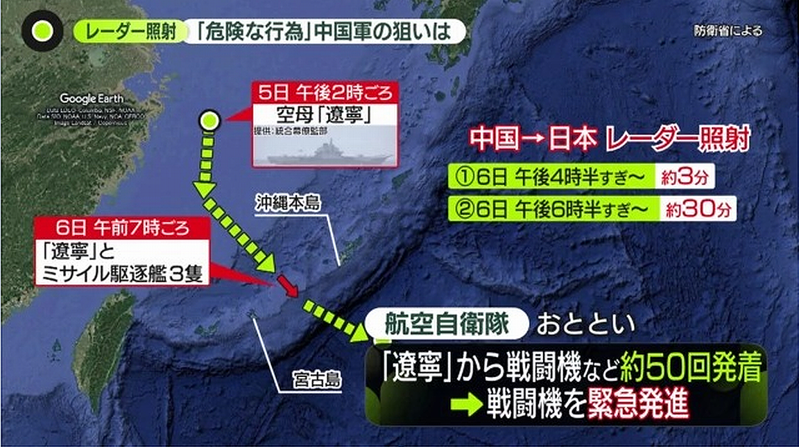 小泉防衛大臣によりますと、6日午後4時32分ごろから35分ごろまでの間に、沖縄本島南東の公海上空で中国海軍の空母「遼寧」から発艦した中国軍のJ15戦闘機が、対領空侵犯措置を実施していた航空自衛隊のF15戦闘機に対し、レーダー照射を断続的に行ったということです。
