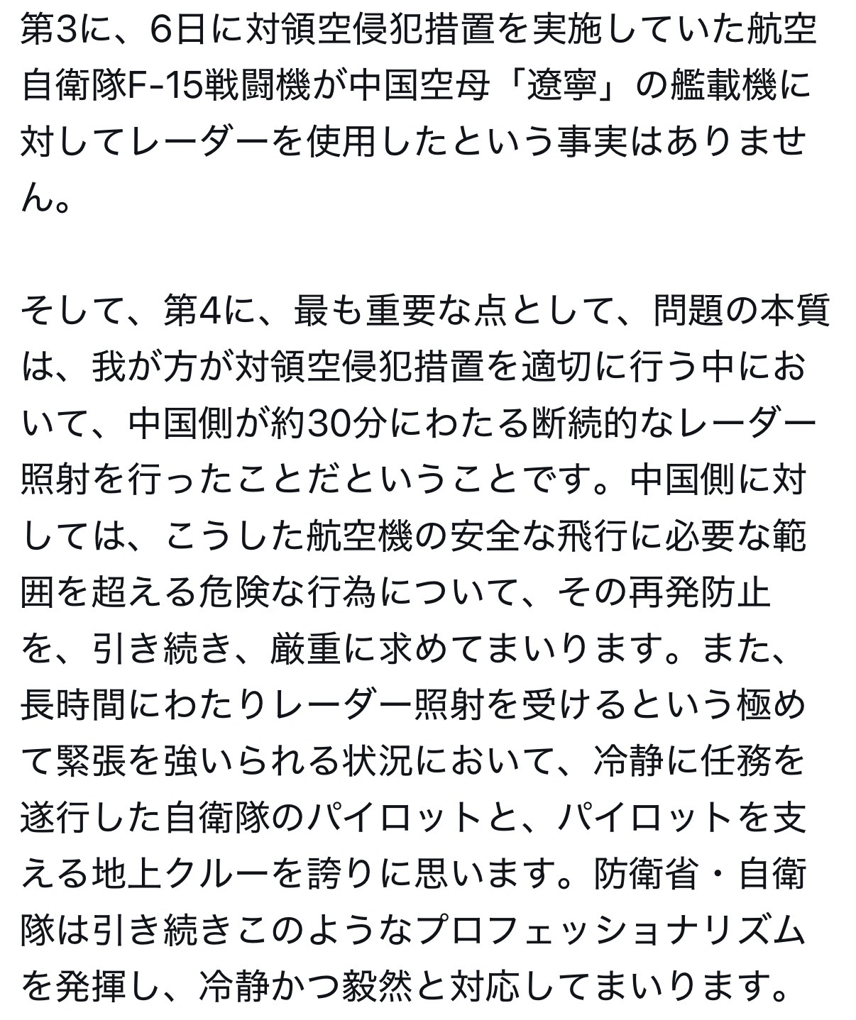 その後、午後6時37分ごろから午後7時8分ごろまでの間にも、同様に、J15戦闘機が、別のF15戦闘機に対し、レーダー照射を断続的に行ったということです。
