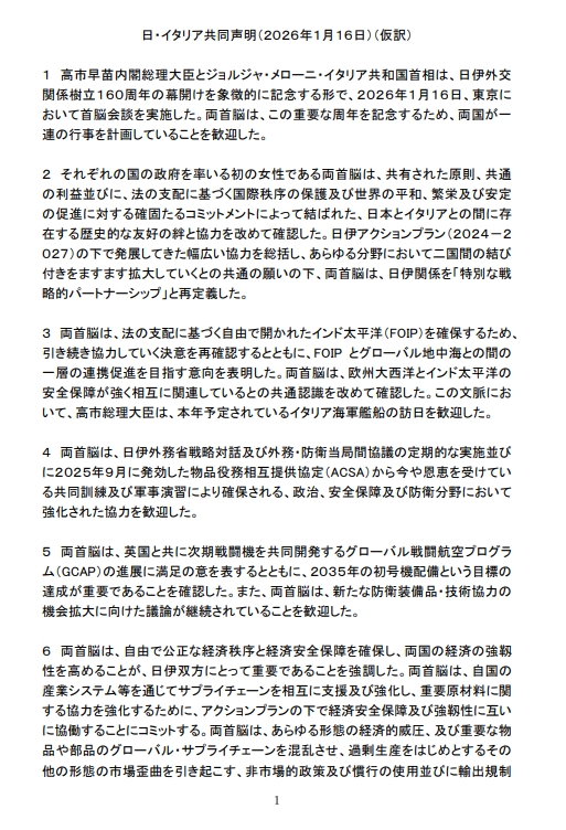 | … | 1無題Name名無し 26/02/05(木)18:20:56 IP:60.137.*(bbtec.net)No.254895+ 1770283256141.jpg-(391483 B) 日・イタリア共同声明(2026年1月16日) |