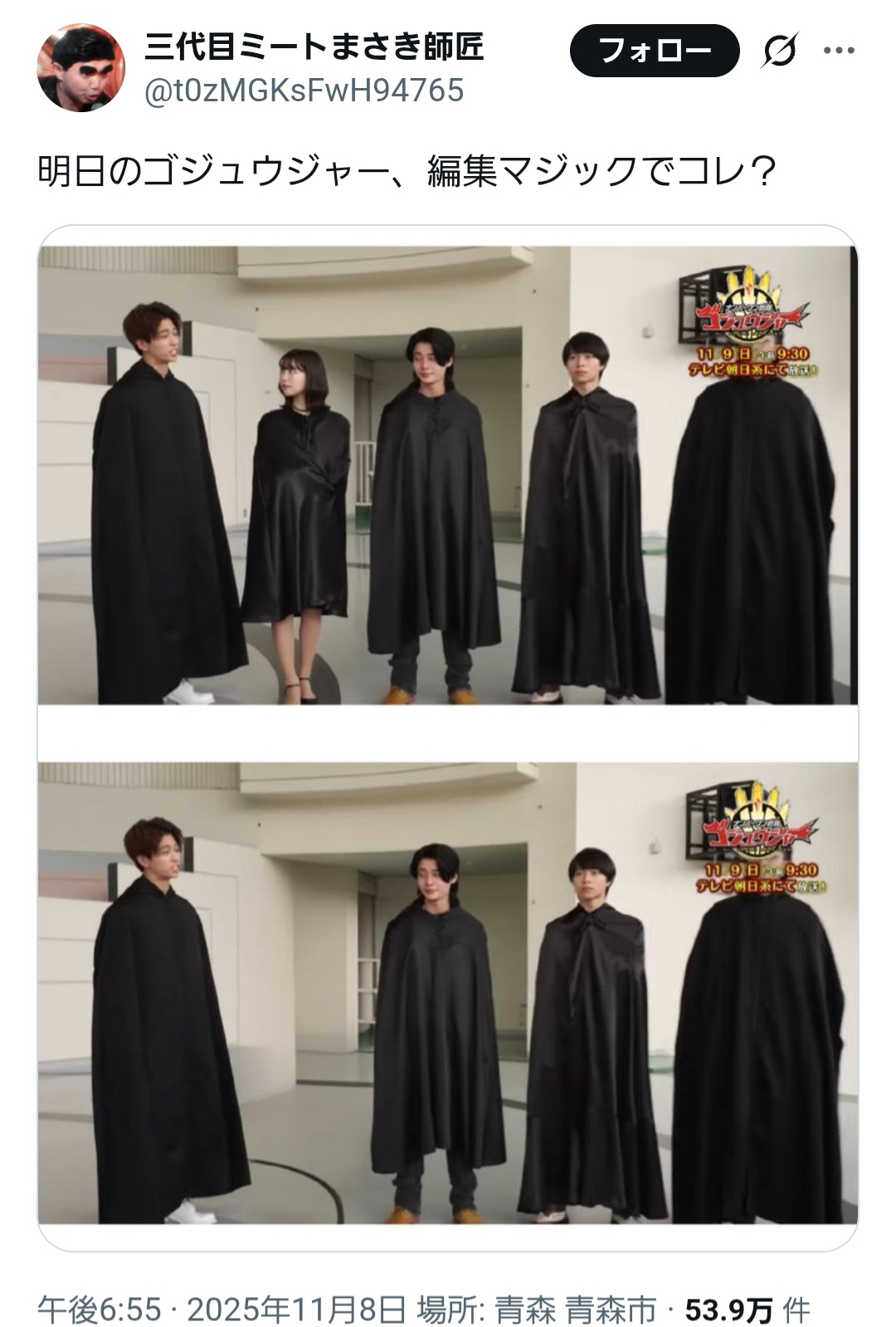 | … | 104無題Name名無し 25/11/09(日)14:31:47 IP:182.171.*(nuro.jp)No.3036326そうだねx5>放送前に未成年飲酒が発覚しゴジュウジャー関係者はてんやわんやってのが今の状況だと思うぞ |