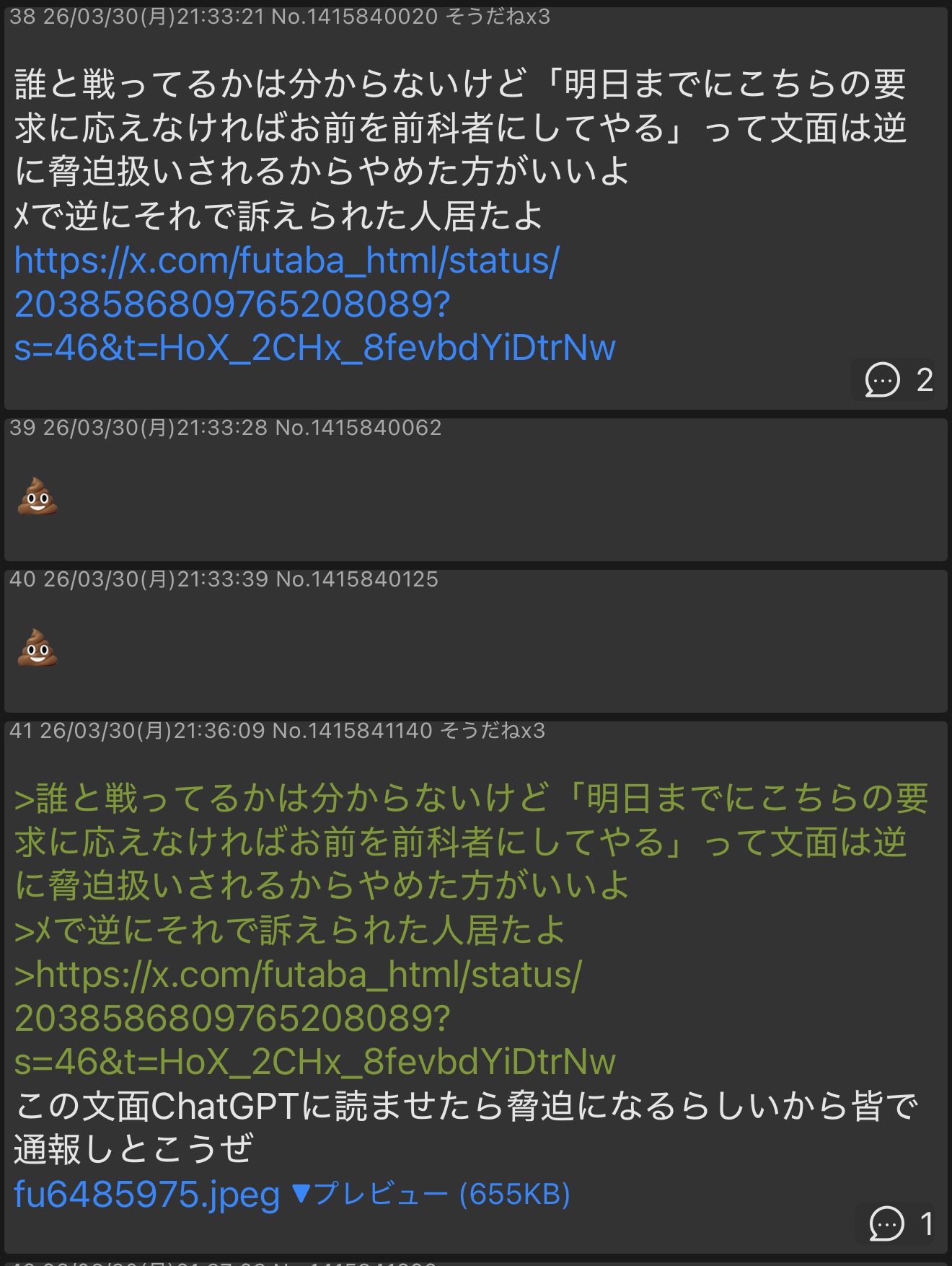 | … | 14無題Name名無し 26/03/30(月)22:48:56 IP:111.191.*(bbtec.net)No.3083189+ 1774878536847.jpg-(377757 B) imgでお前の脅迫通報されてたらしいじゃん |