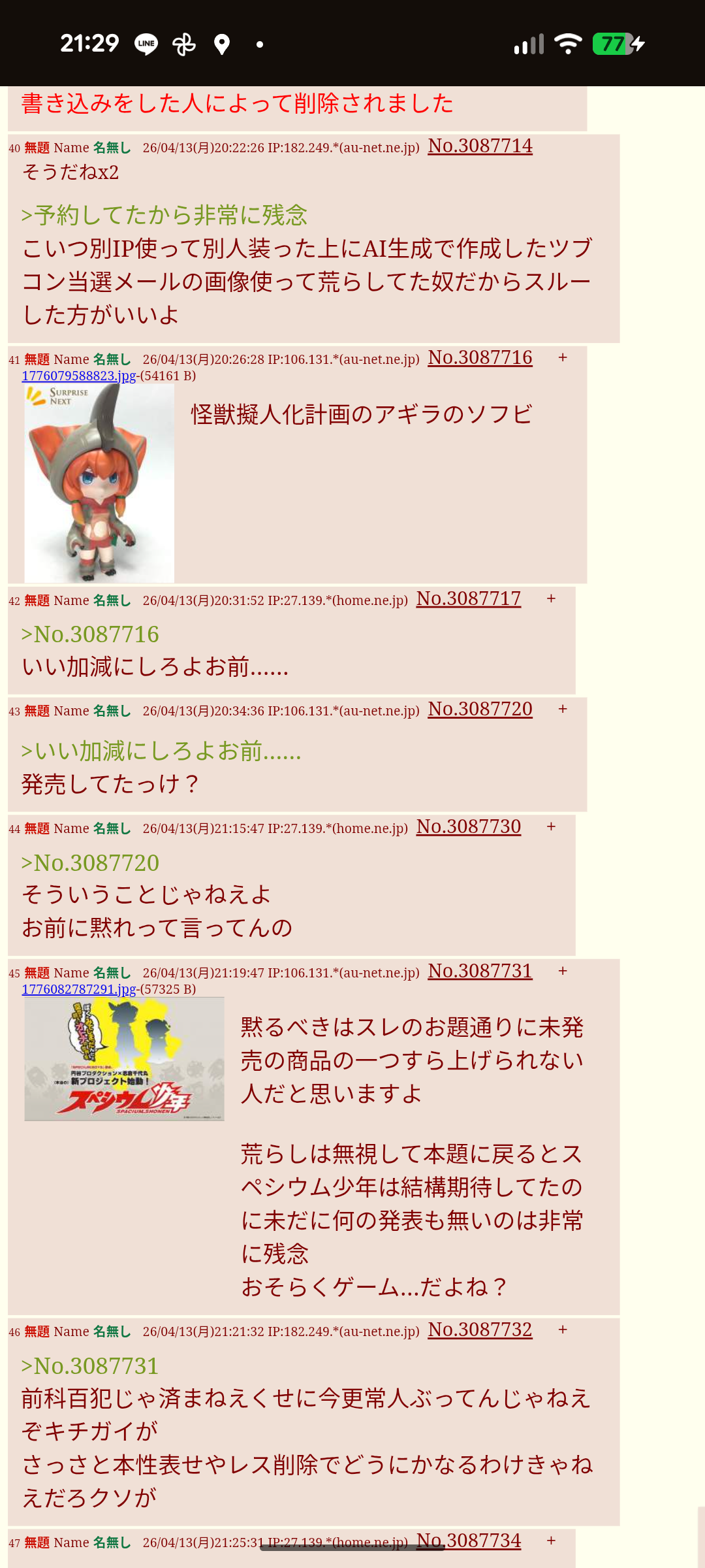 | … | 4無題Name名無し 26/04/19(日)23:28:57 IP:126.35.*(panda-world.ne.jp)No.3089713そうだねx3131auはこの掲示板に何年も通ってる二葉トシゾーなのは間違いないよ |