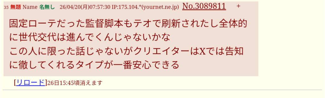 | … | 5無題Name名無し 26/04/19(日)23:36:05 IP:118.154.*(dion.ne.jp)No.3089722そうだねx6どうでもいいこんなゴミカス |