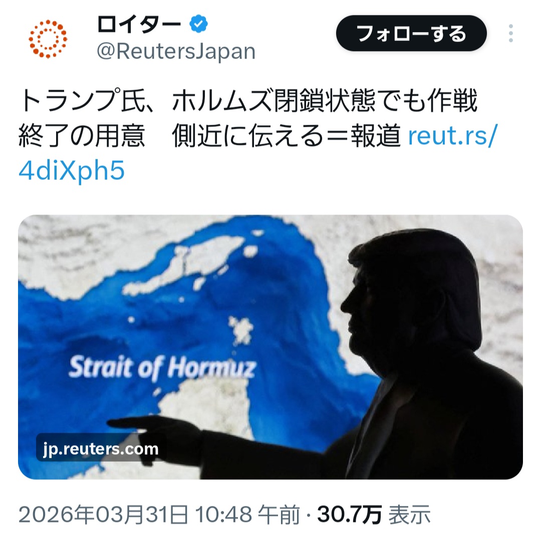 | … | 71無題Name名無し 26/03/28(土)12:14:03 IP:116.70.*(j-cnet.jp)No.258990そうだねx2>トランプの事だから停戦条件に海峡の通行料徴収を認めて |