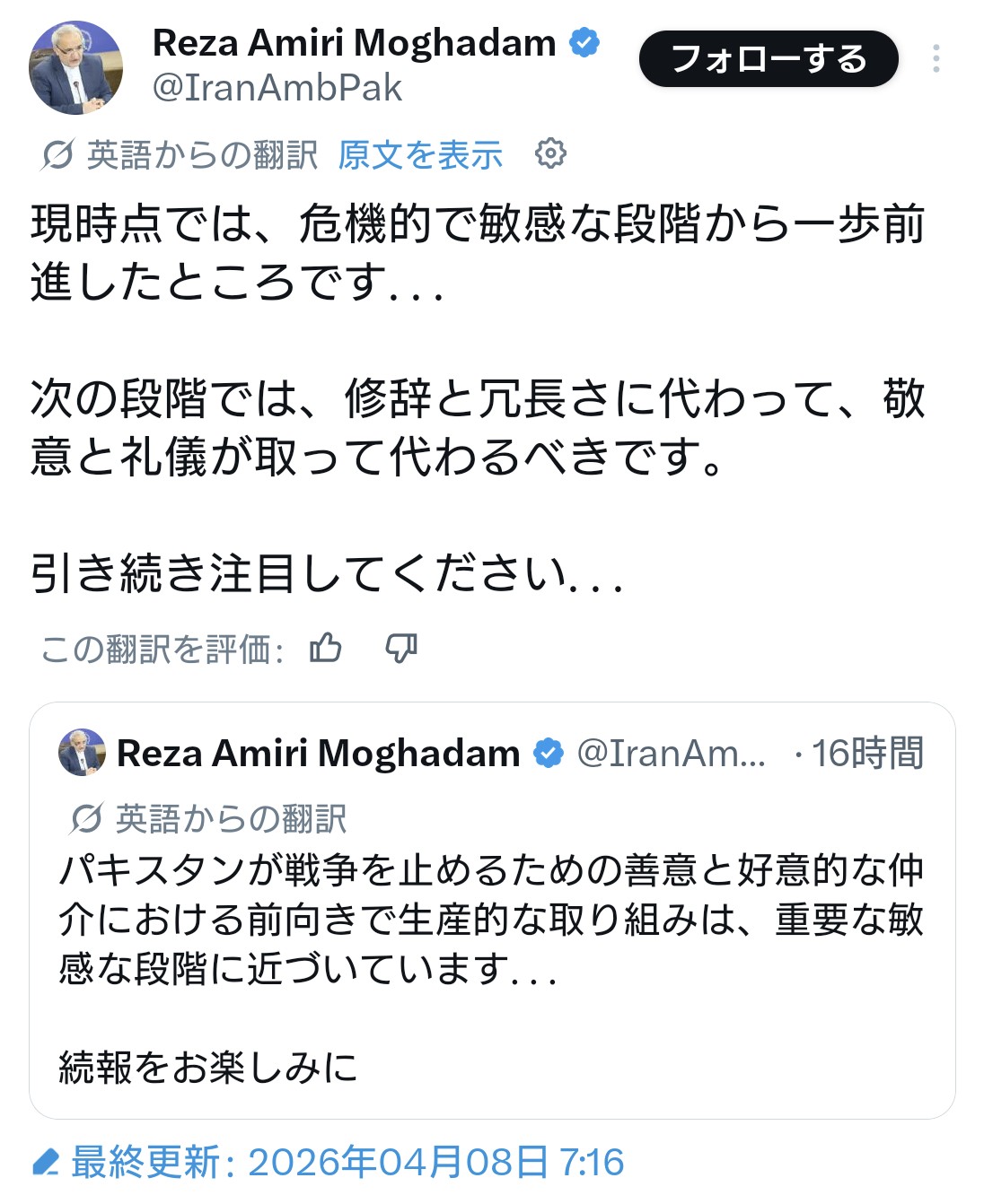 | … | 750無題Name名無し 26/04/08(水)11:02:52 IP:217.178.*(transix.jp)No.260216+イランのアラグチ外相のX投稿 |