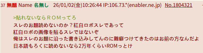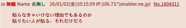 | … | 1無題Name名無し 26/01/02(金)10:28:33 IP:14.9.*(enabler.ne.jp)No.3055268+完全無能 IP:106.73.*(enabler.ne.jp) |