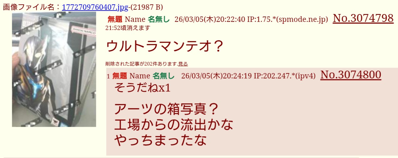 | … | 1無題Name名無し 26/03/20(金)13:41:18 IP:1.75.*(spmode.ne.jp)No.3079690そうだねx1最初に青いウルトラマンとかのバレ投下した人が認めてるので確定かと |